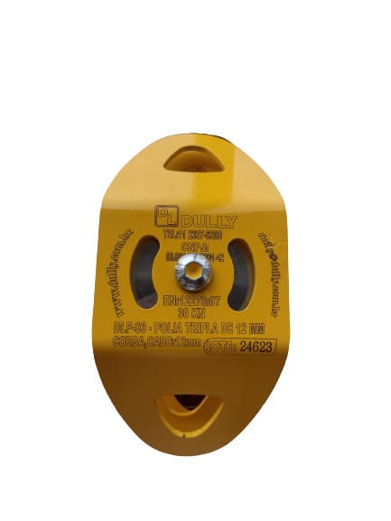 Linha Utilizada: Corda e Cabo de Aço de até 12 mm, Qtde de roldanas: 03 Roldana em Aço Galvanizado, Resistência Estática: 15 KN (1500KG), Carga trabalho para massa de até: 100 KG